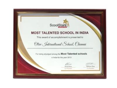 Most Talented School in India – This Certificate was proudly presented to Olive International School in 2019 by School Stars.
