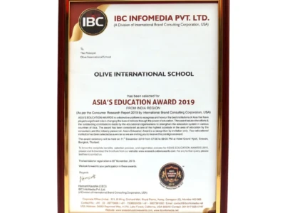 Asai’s Education Award 2019 – Certificate was awarded by IBS INFORMEDIA PVY. LDT. USA to the Principal of Olive international school at Asai’s Education Award conference held on 11th December 2019 at Hotel Grand Hyatt, Erawan,Bangkok, Thailand.
